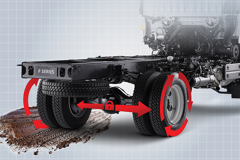 The no-spin differential links the truck’s rear wheels together with an automatic locking dog system to prevent single wheel spin in slippery conditions.